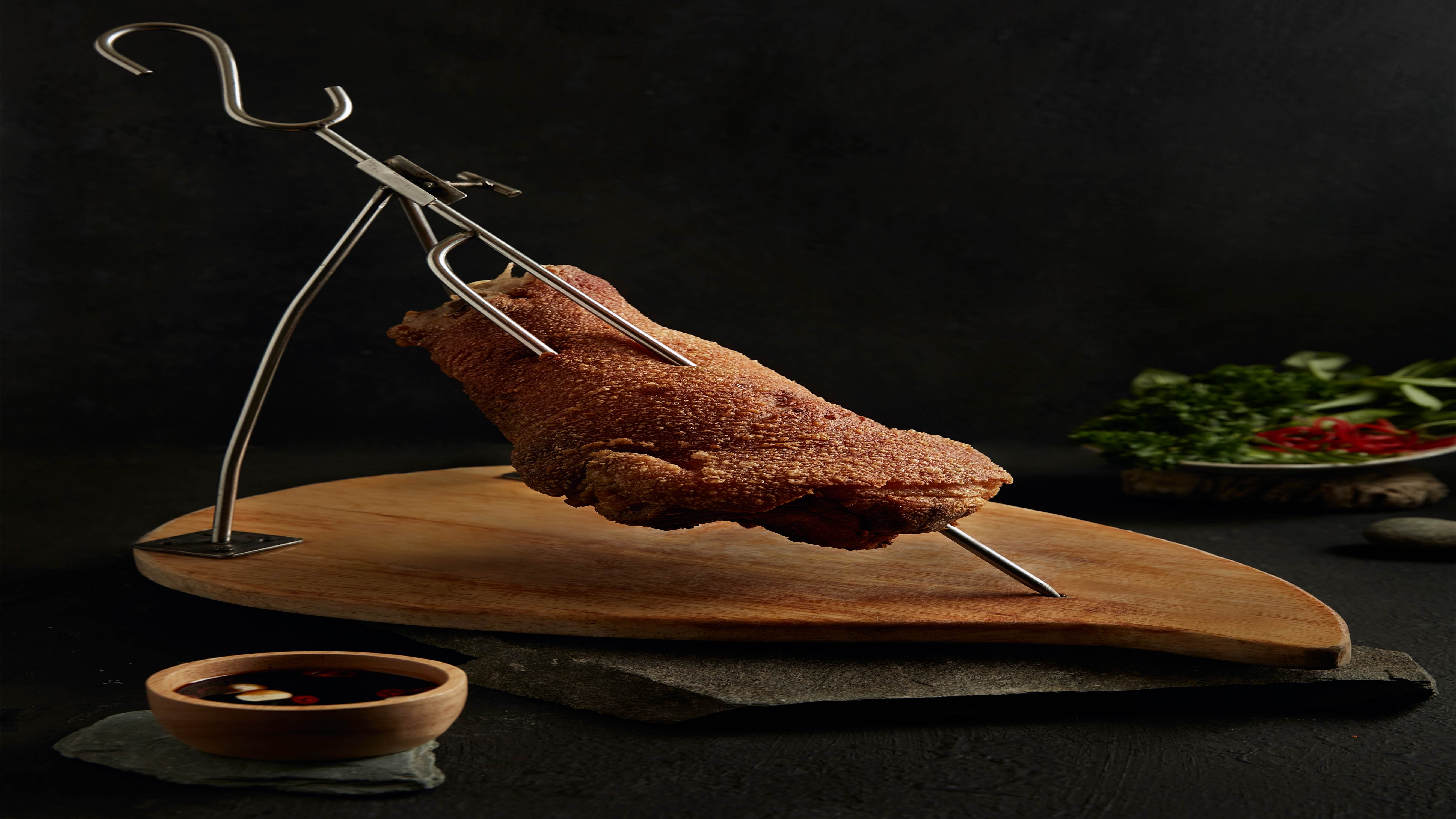 Lớp da giòn được chế biến công phu bao gồm ướp gia vị và chiên ở nhiệt độ cao để da heo nổ bung , tạo nên âm thanh vui tai khi thưởng thức , món Đùi Heo Nổ Bì được ăn kèm nước chấm đặc biệt, tạo nên sự cân bằng hoàn hảo của Đùi Heo.